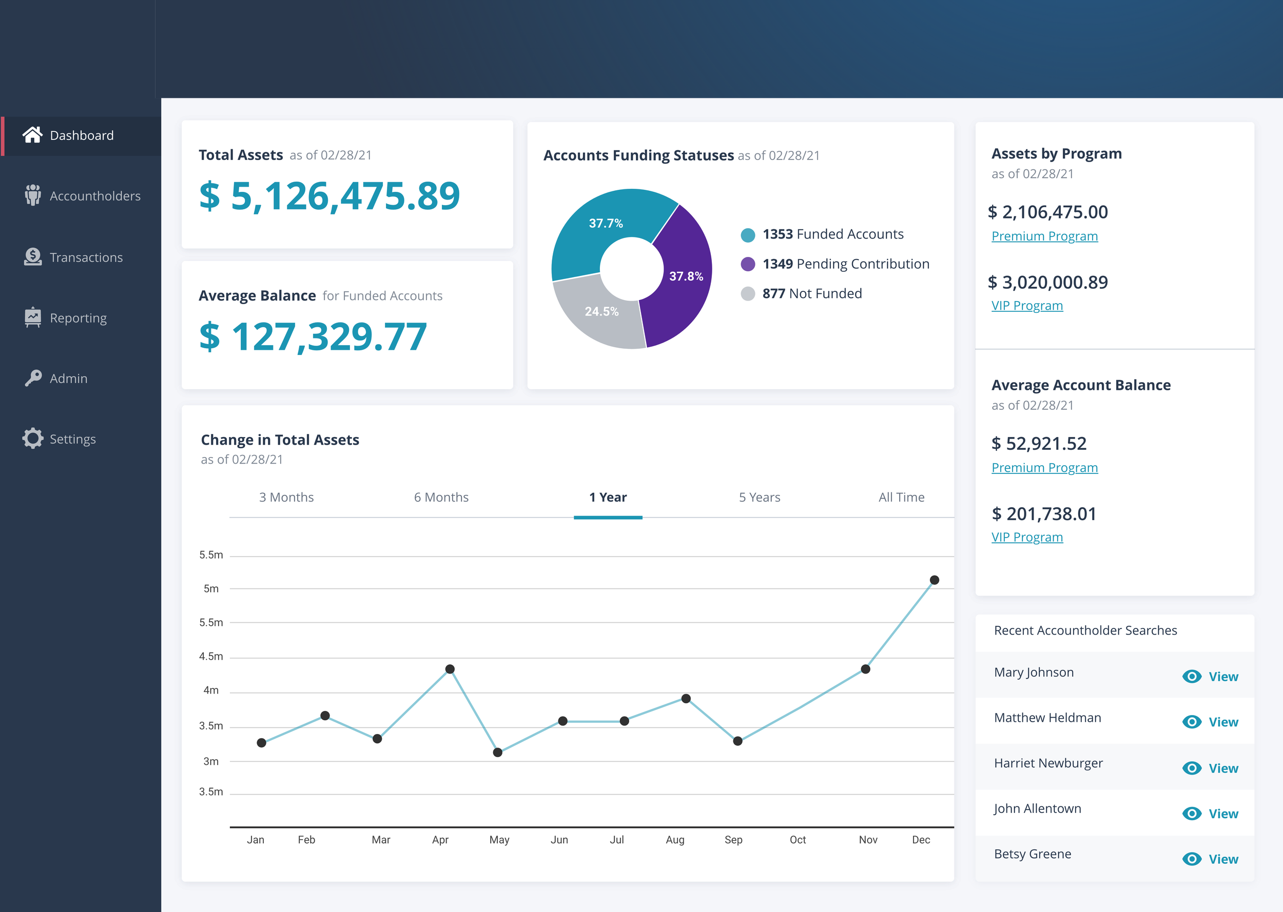 What’s Happening with your Accounts: Generate an Accountholder Data Report to see your Total Assets Under Management (AUM), average account balance, and activated/funded accounts in your program. This report can also be used to collect all of the accountholder contact information across your program.See How you’re Invested: Generate a Total Assets and Shares Report to see all of your program’s funds and each fund’s shares, price, market value, and % of portfolio.All of the Fees in a Selected Date Range: Generate a Fee Data Report to see all of the fees charged to each accountholder in your program within a set date range.